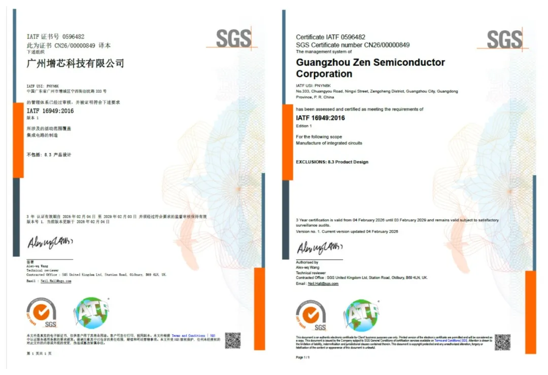 自推进“立足湾区,服务全球”国际化战略以来,增芯科技积极导入欧洲车规工艺与质量管理体系,兼顾海外合作与国内产能保障,全力推动国产芯片从“备选”走向“主选”。此次IATF16949认证的落地,为公司对接全球汽车产业链伙伴、拓展车规芯片市场提供了坚实保障,也为国产汽车芯片产业高质量发展注入新动能。